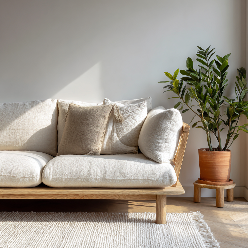 If your living room feels chaotic, mismatched colours are usually the culprit. Japandi living rooms use neutral, warm tones that instantly create a sense of calm: