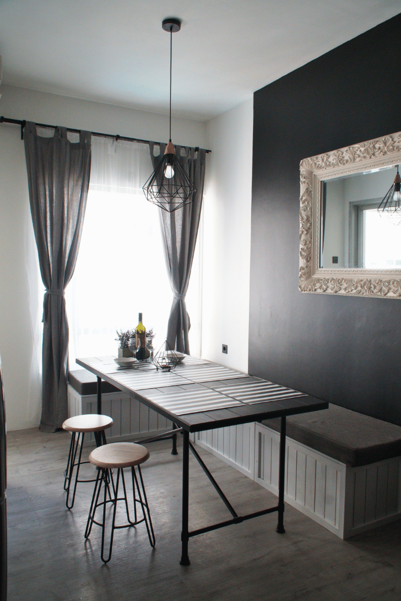 Industrial-style dining room with multifunction benches for storage and black accent wall.