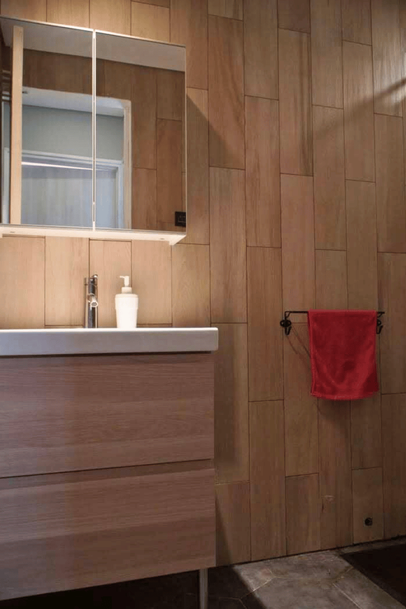 Use ceramic tiles with wooden texture to give modern look. The vertical tiles gives additional height to the tiny bathroom